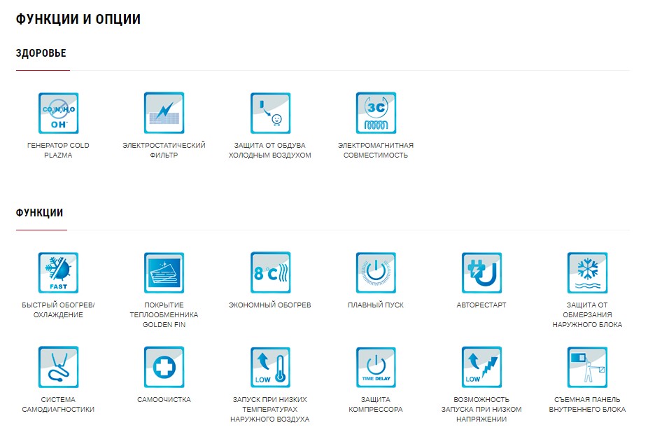 Таймер, часы на пульте, режим "Турбо", работа в режиме "Сон", широкий поток воздуха, многоскоростной вентилятор, цветной пульт, звуковое оповещение, блокировка пульта ДУ.